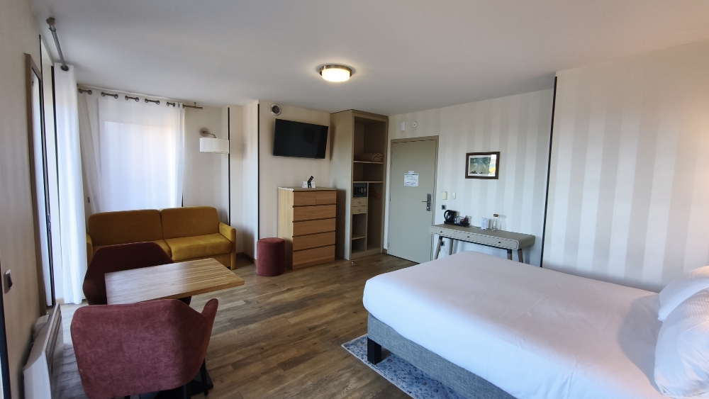 EQUIPEMENTS : TV écran plat, WiFi gratuit, téléphone, coffre-fort, placard avec penderie, volets roulants électriques, porte-bagages, plateau de bienvenue, bouilloire, salle de bains avec douche, WC, sèche-cheveux.